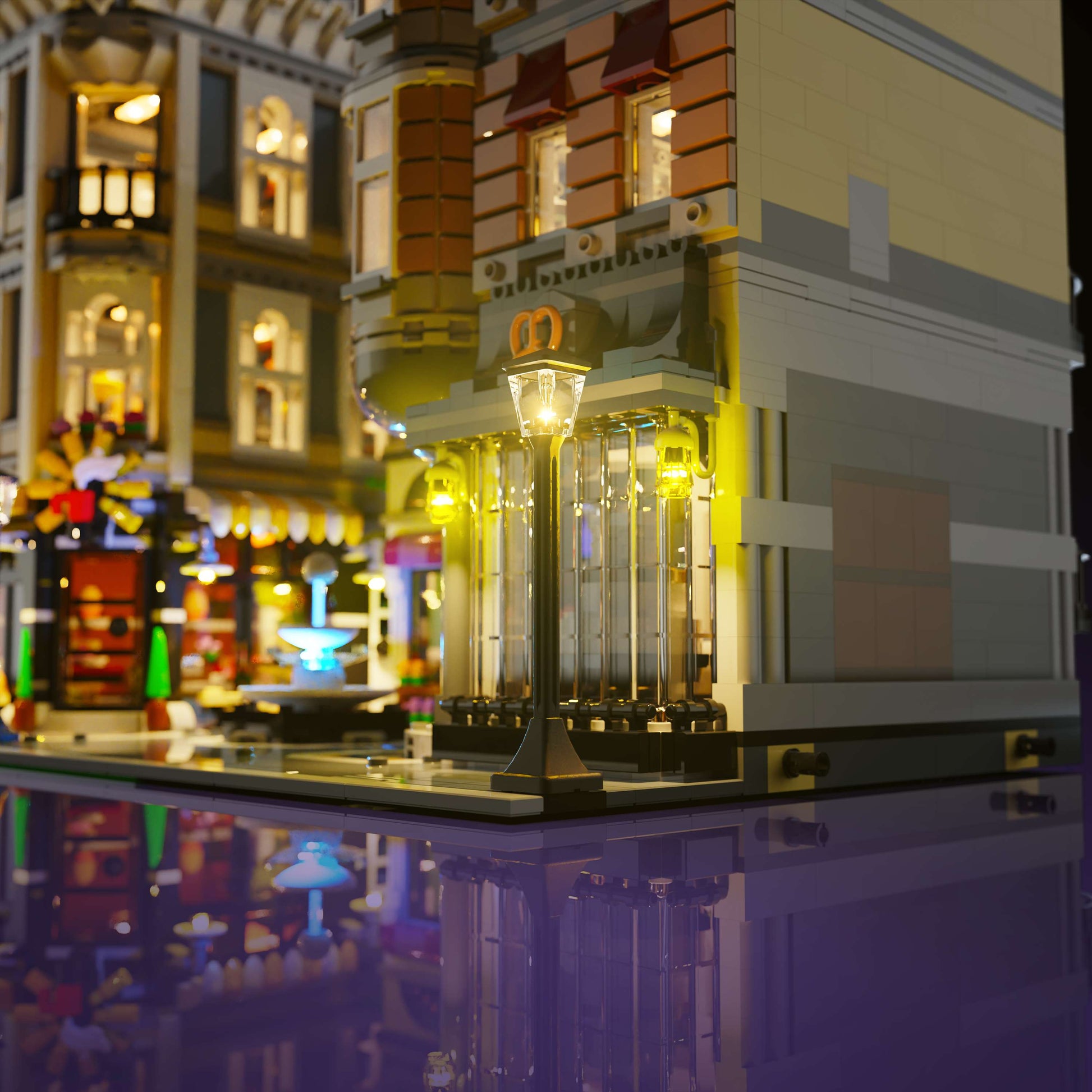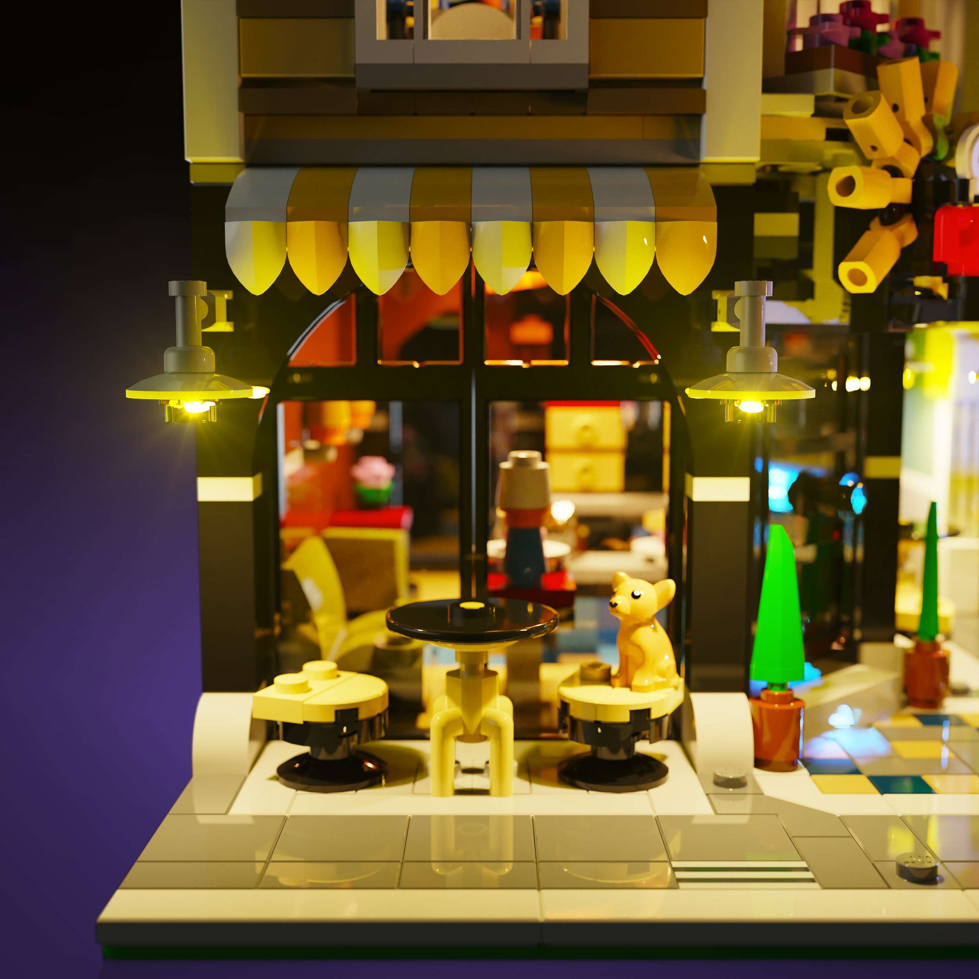 Designed to highlight every feature of your LEGO® Assembly Square iconic set, the Light My Bricks™ custom lighting kit is the ideal accessory. Our Flux Touch Plates ensure connectivity without messy, tangled cables, and warm white Meteor Lights give a soft, rich light to every interior detail. The central fountain is a key feature and illuminated by a soft, light blue Astro Light to give vibrancy and a focal point for the set.