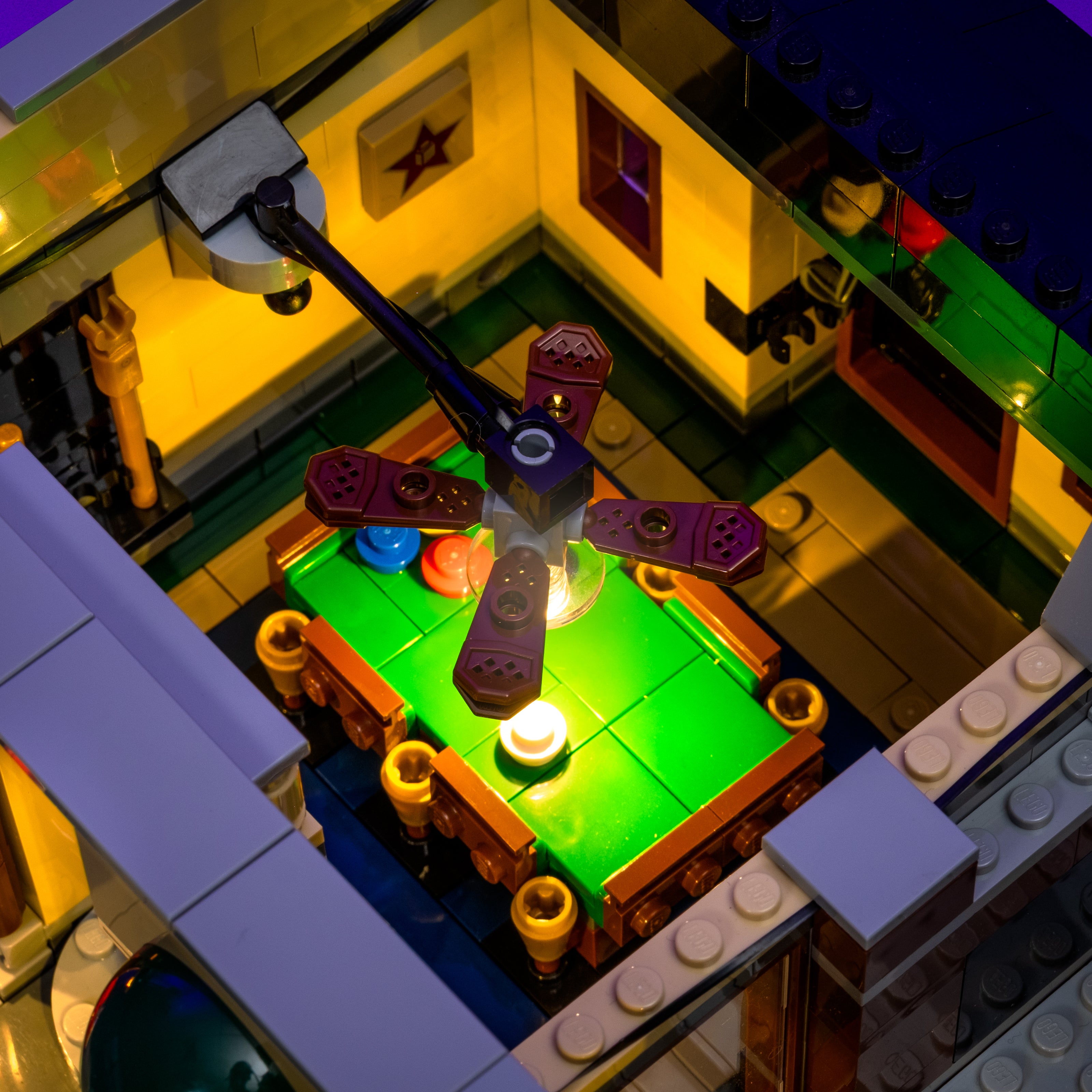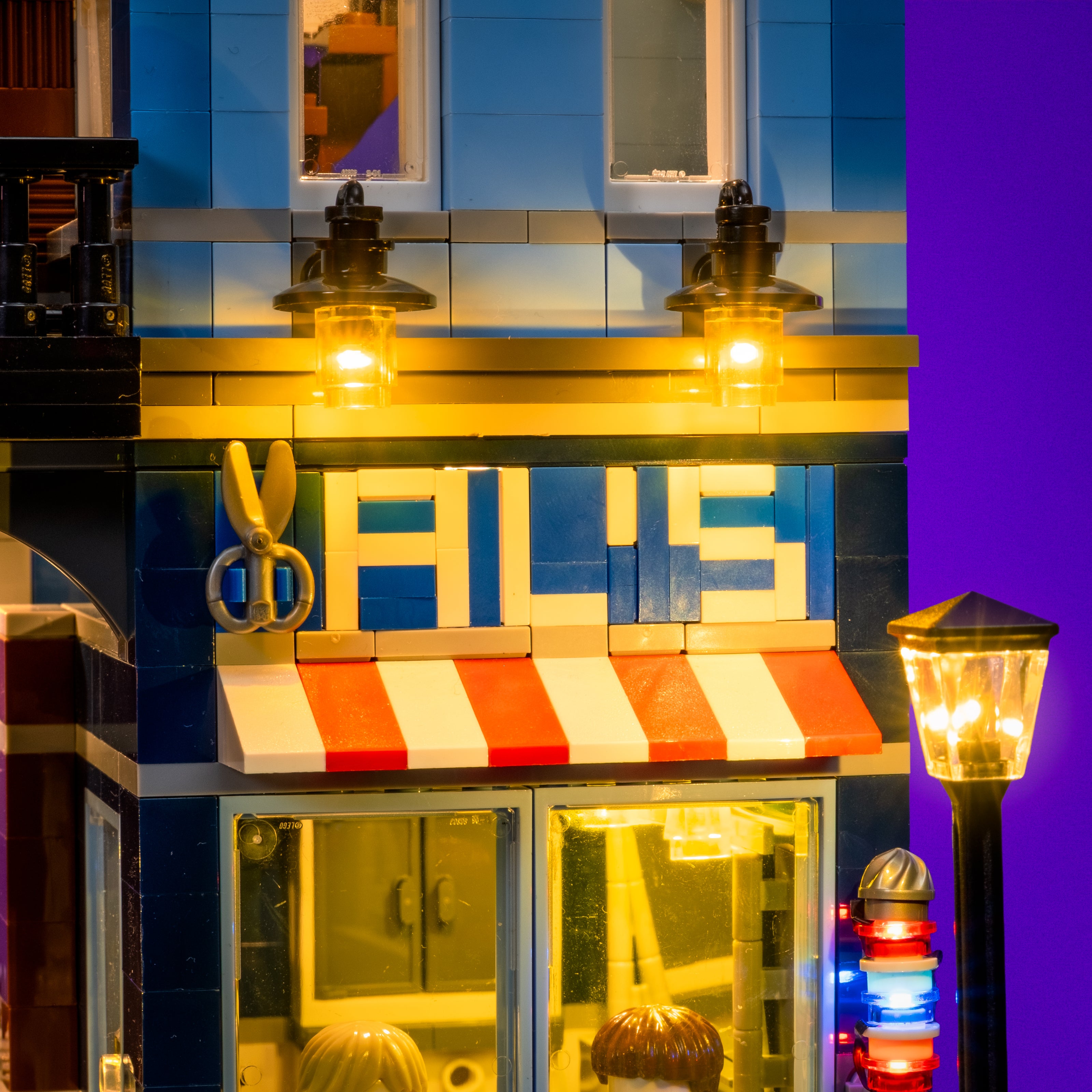 Step back into classic noir with a custom Light My Bricks™ Light Kit for the LEGO® Creator Detective’s Office 10246, the very first set we ever brought to life with lights. Warm white LEDs illuminate the interiors, while our signature lamp posts and glowing yellow lanterns create a vintage streetscape straight out of the 1940s. The iconic POOL sign and barber’s pole now feature a rotating string effect for extra realism, while carefully placed lights on the barber shop wall sconces and detective’s desk highlight the story-rich details inside. With Flux Touch Plates for easy level removal, this kit blends playability with display perfection, making the Detective’s Office shine brighter than ever.