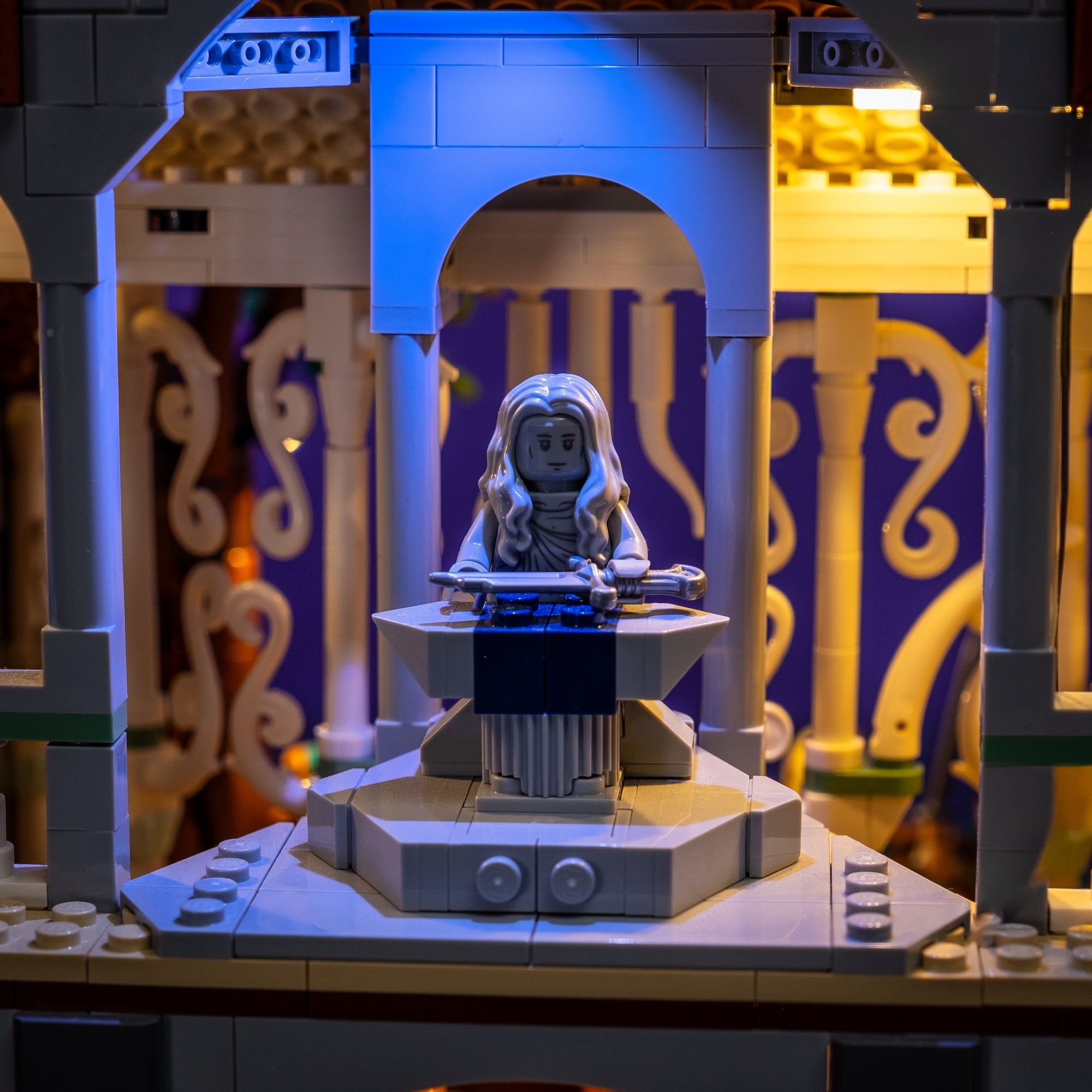 But the cinematic realism doesn't stop there! The iconic Shards Of Narsil are highlighted in ethereal moonlight from a masterfully-placed Astro Light, and flickering Astro Lights cast shadows throughout the interior, as well as bring the torches to life on the forge. Countless details from this iconic scene in Tolkien's epic story will reveal themselves as you build and light your set, creating the perfect display which both film and LEGO® fans will adore.