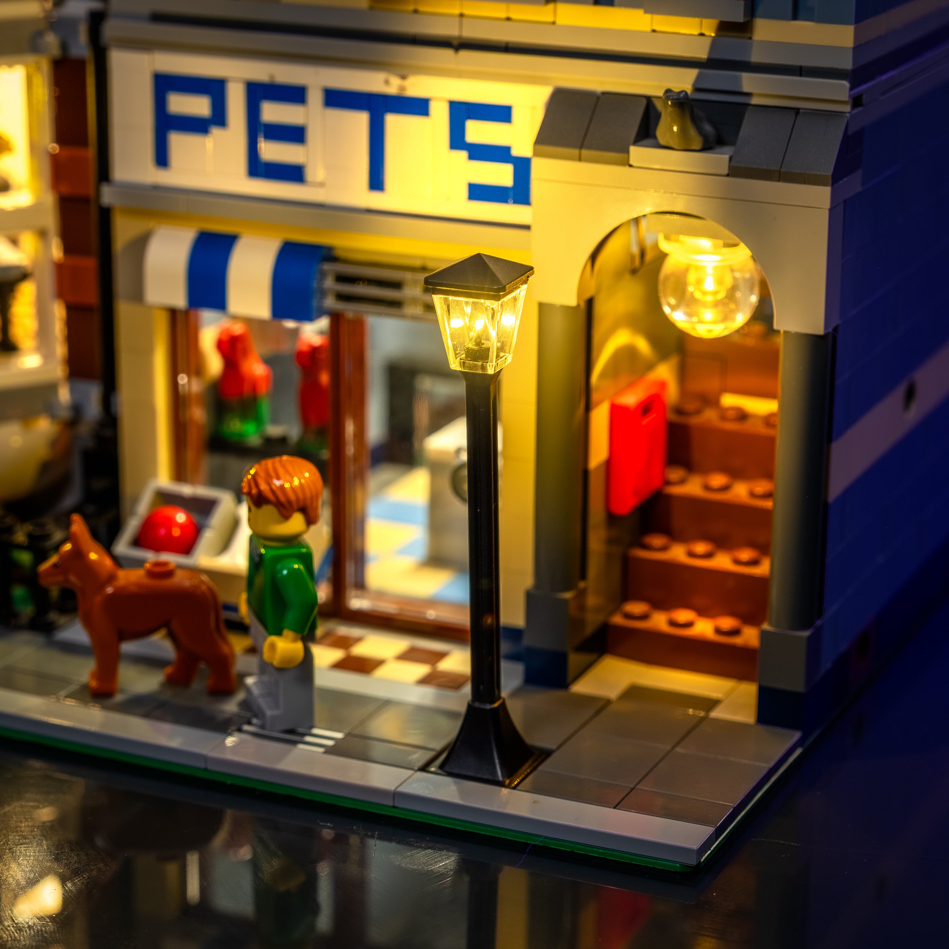 Bring warmth and charm to your modular street with a custom Light My Bricks™ Light Kit for the LEGO® Creator Expert Pet Shop 10218. A softly glowing lamp post welcomes visitors, while cool white ceiling lights and a gentle blue aquarium glow bring the pet shop’s interior to life. Upstairs, warm yellow lanterns, flickering fireplaces, and cosy bedside lamps create an inviting atmosphere throughout the apartments. With Flux Touch Plates for effortless, wireless level removal, this kit enhances every detail of the Pet Shop—making it the perfect illuminated companion for your LEGO® modular collection.