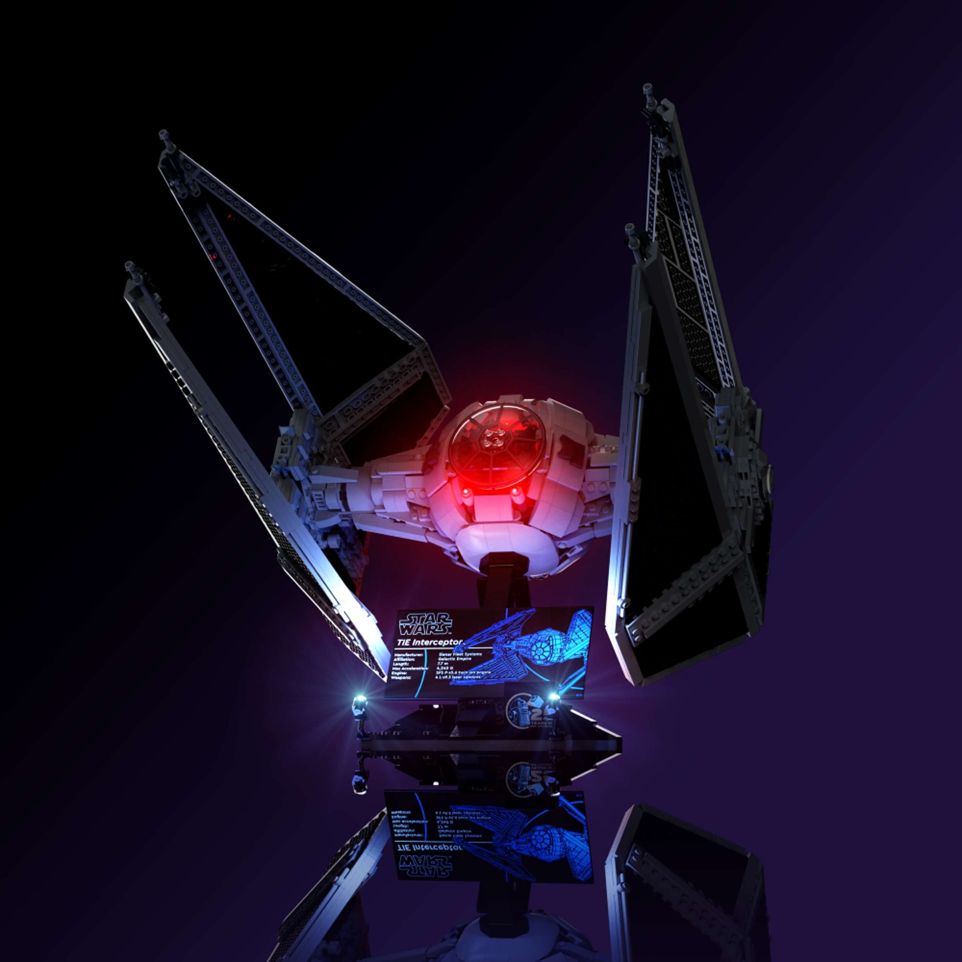 Relive the action from the Star Wars saga when you light up your TIE Interceptor using Light My Bricks™. All up, there 7 lights in this kit, all carefully designed to highlight the TIE Interceptor's distinctive wings, detailed cockpit, laser cannons and rear engines.