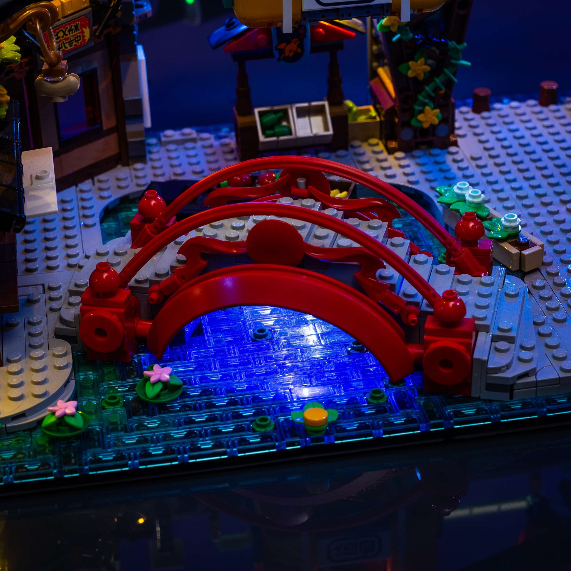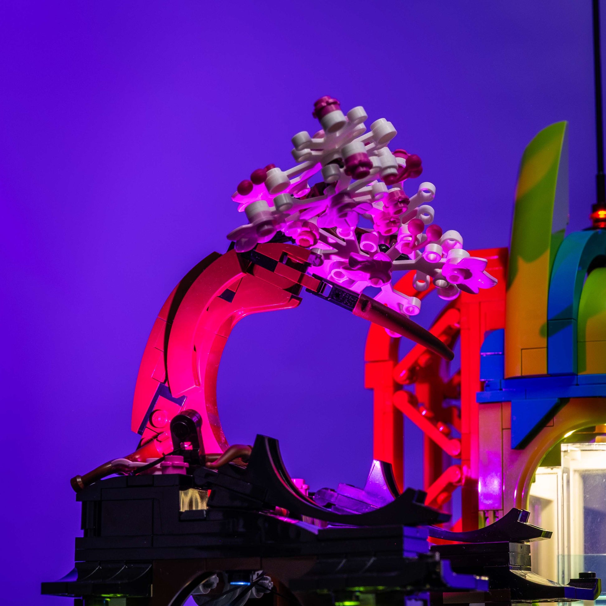 Light up the vibrant energy of the LEGO® NINJAGO® City Markets 71799 with a dynamic Light My Bricks Lighting Kit, designed to complement the aesthetic of the NINJAGO City Workshop Light Kit. Bursting with bold, colorful LEDs, this setup keeps every floor, fixture, and detail alive—from flickering oven flames in the bakery to glowing blue water under the red bridge. Functional play features like the cable car and lifts remain fully operable, with clever lighting integrated seamlessly, including self-powered lights in the cable car and subtle warm tones throughout the market. Whether viewed from the front or admired in full, this light kit brings the city to life with atmosphere, movement, and immersive charm.