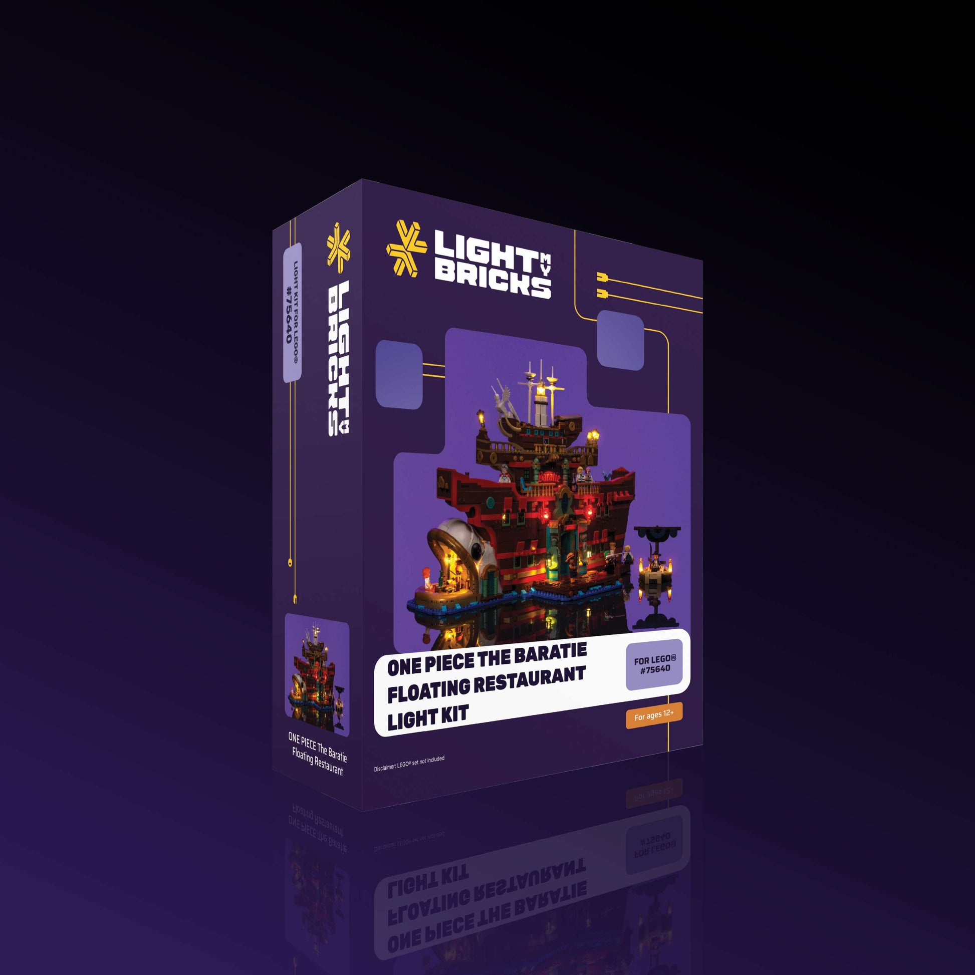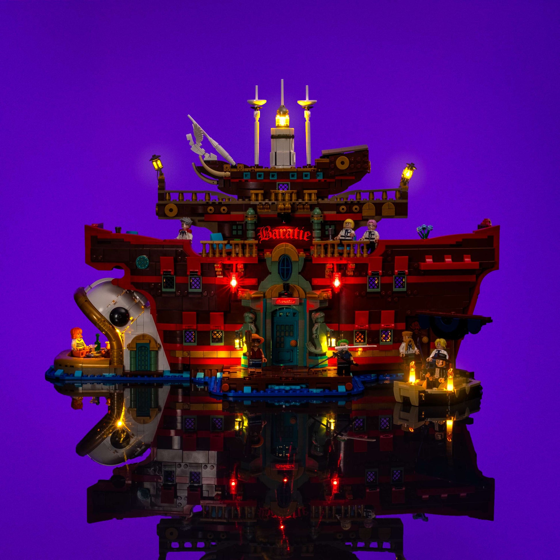 Set sail for adventure with a custom Light My Bricks™ Light Kit for the LEGO® ONE PIECE The Baratie Floating Restaurant 75640, designed to capture the atmosphere of the live-action series with stunning accuracy. Bold red lights illuminate the Baratie signs and lanterns at the bow, while warm white and yellow LEDs fill the restaurant’s rooms with a welcoming glow. A glowing green centerpiece recreates the shimmering ocean effect from the show, with flickering candles and carefully balanced ceiling lights adding depth and realism throughout. Even Mihawk’s boat is lit for battle, ensuring this set remains fully playable while shining as a true centerpiece of any ONE PIECE collection.