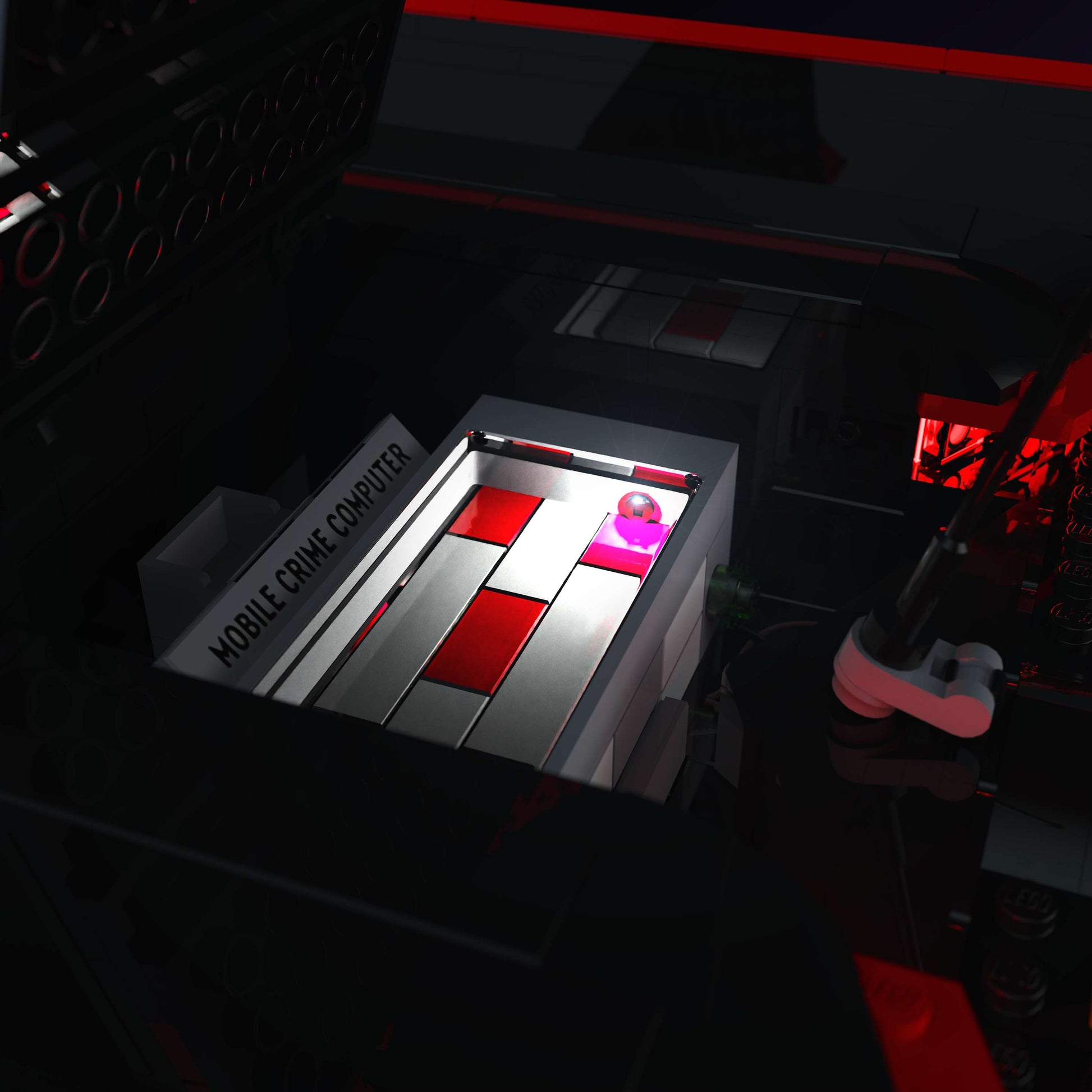 • Detailed LEGO model with a vehicle, house, and various elements on a dark background