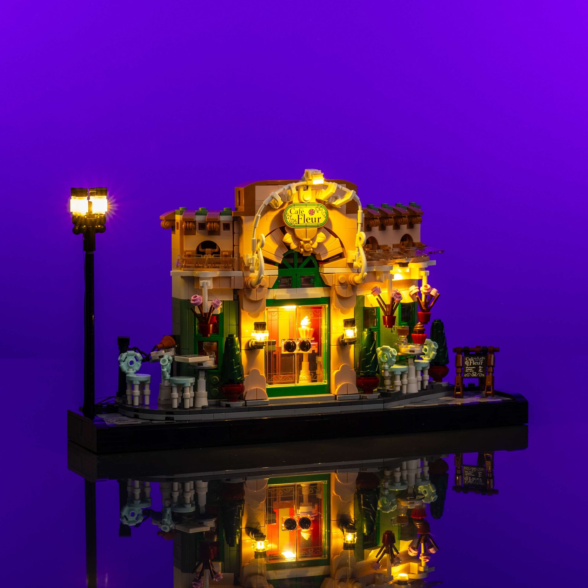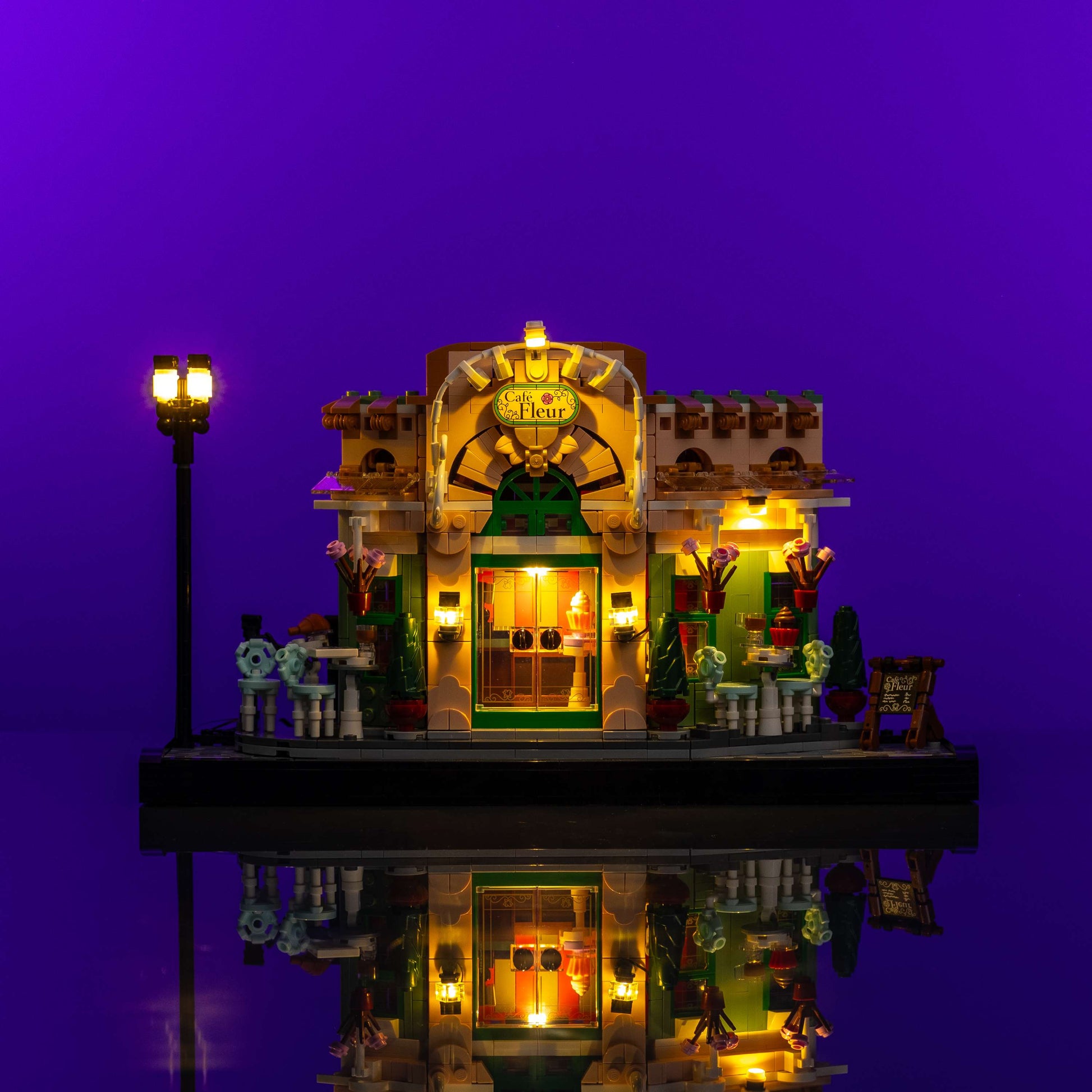 Show off your true Parisian style with our LEGO® French Café lighting kit, curated by the Light My Bricks™ team. Designed to create a warm and welcoming ambience, the kit features Micro Astro warm white lights for the street lamp and door lanterns, plus a flickering candlelight inside to add life and vibrancy. Spotlight-style lighting on the Café Fleur sign and outdoor seating area bring charm and realism to the scene. Perfect for showcasing your modular set with a real-life atmosphere, this kit transforms your build into a cosy, evening street-side café scene.
