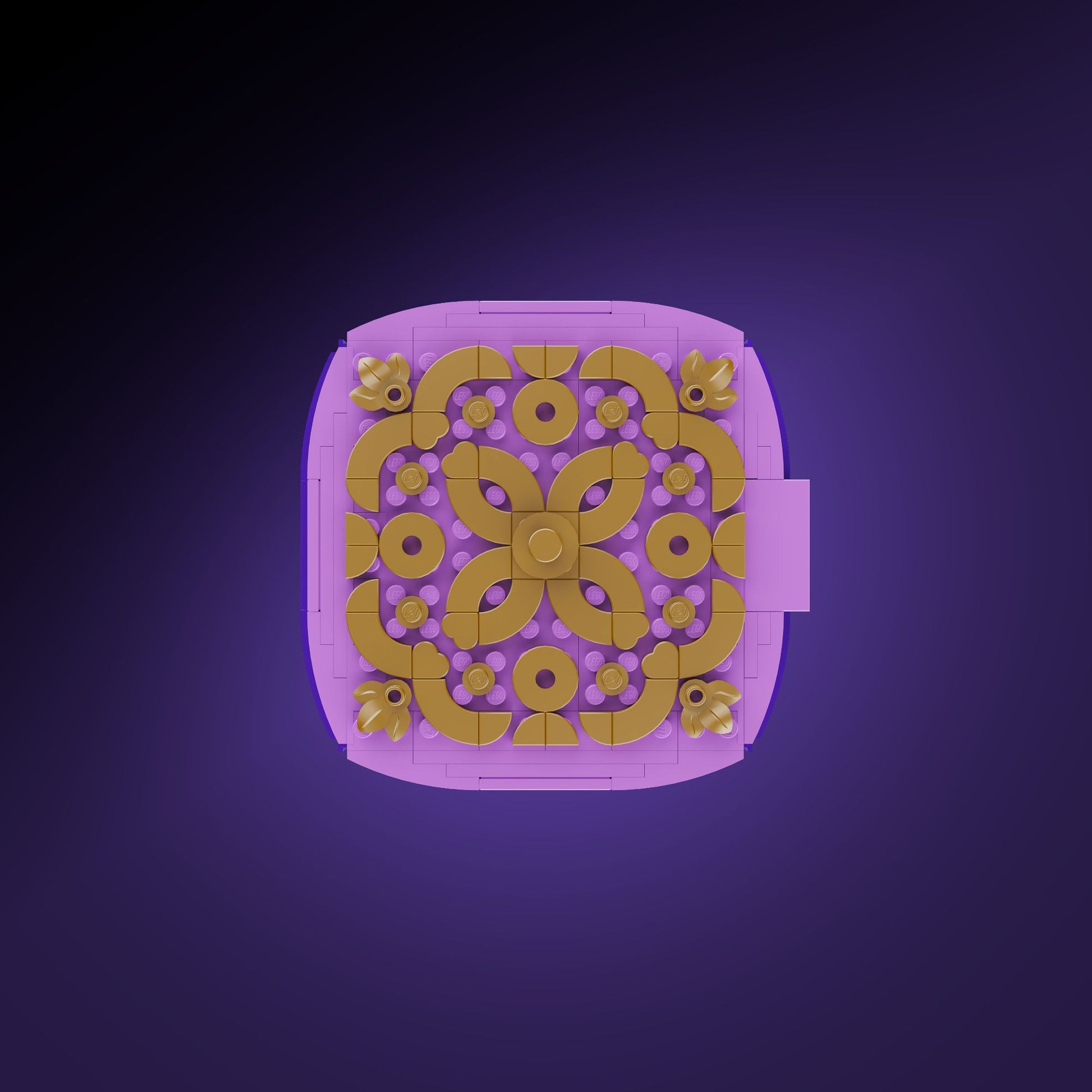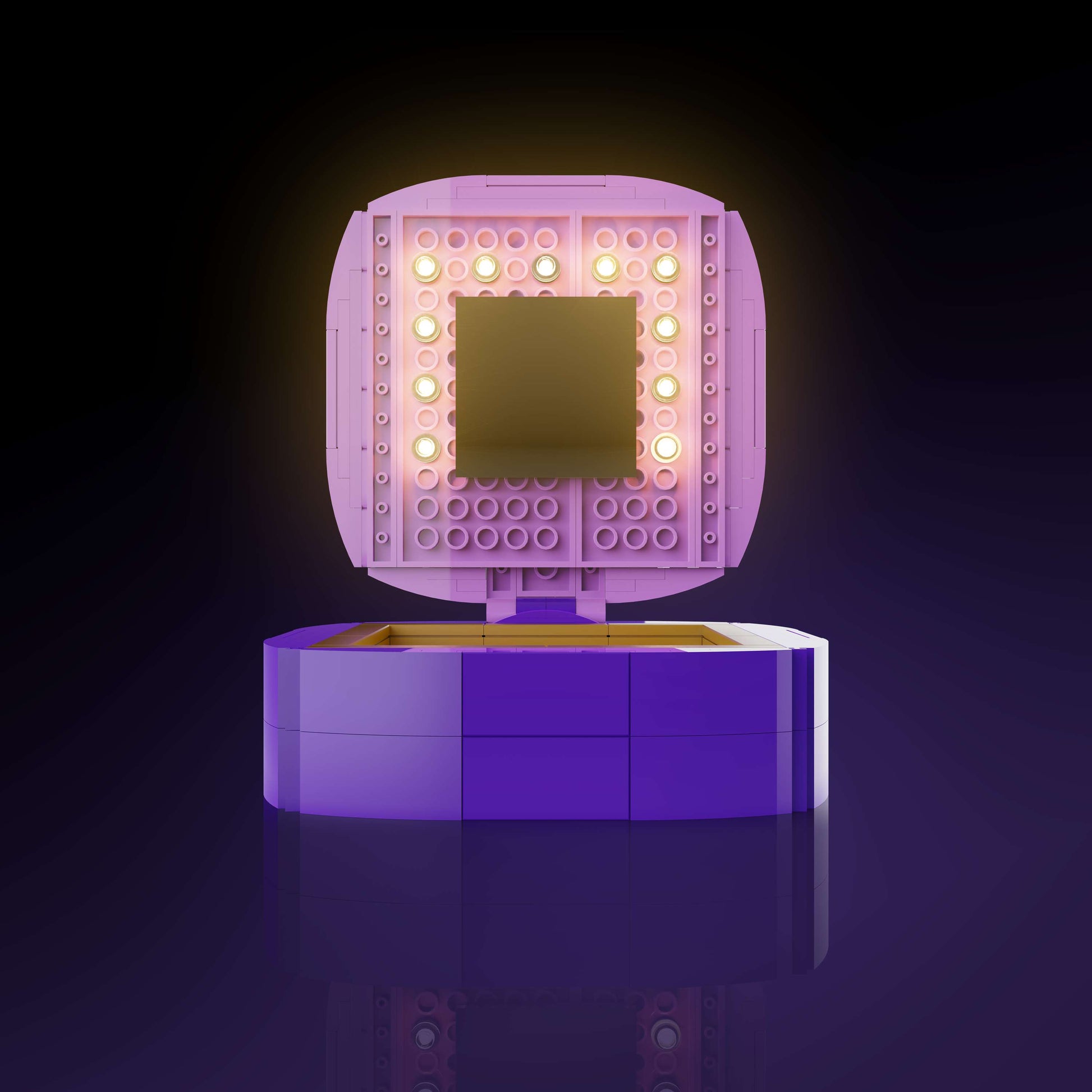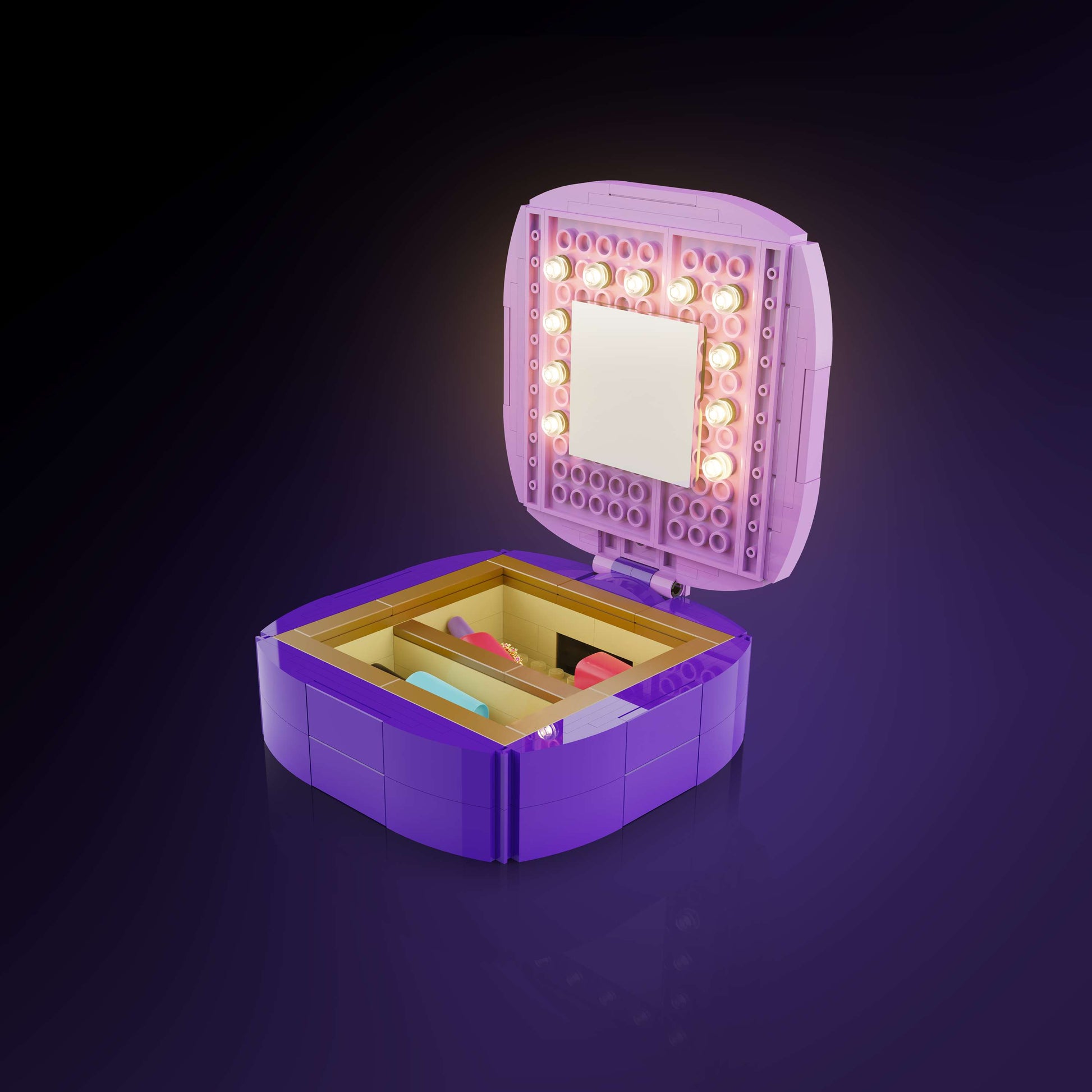 Our Light My Bricks™ Jewellery Box in royal purple brings vibrancy and elegance to your jewellery collection. Designed with golden ornate pieces for a charming aesthetic, this box includes a movable separator so you can organise your treasures to perfection. Vanity-style Hollywood lights in a warm white string enhance the mirror and add a glamorous touch. Powered with our built in Power Brick, you’ll have the ultimate portability and elegance wherever you go. The flux belt offers continuous lighting, ensuring your jewellery box is beautifully lit at all times. An essential for any jewellery enthusiast, this charming and functional display piece brings creativity and next-level elegance to your collection.